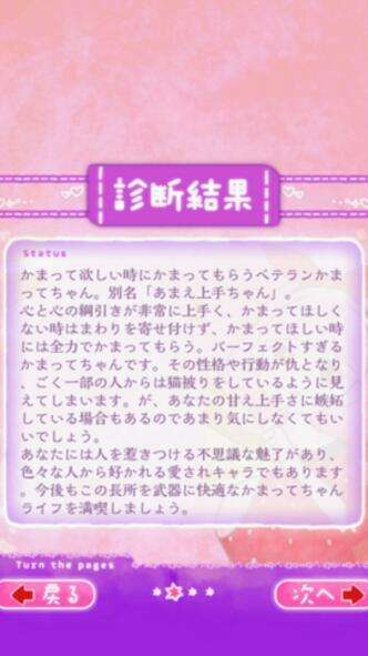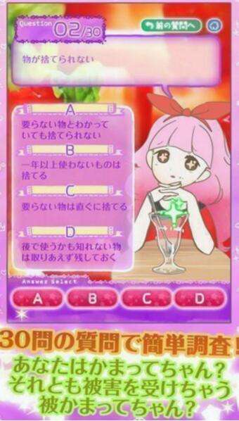 游戏以简单的测试内容为主要的游戏内容。玩家在游戏中可以测试自己是不是身边人所讨厌的缠人精,简单的测试中也可以体验到轻松的游戏模式哦。