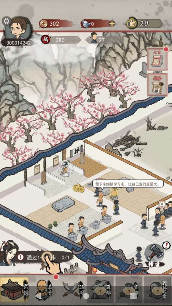 1.卡通国风的精致画面吗,梦回江湖世界,通过经营武馆探索武侠世界。
