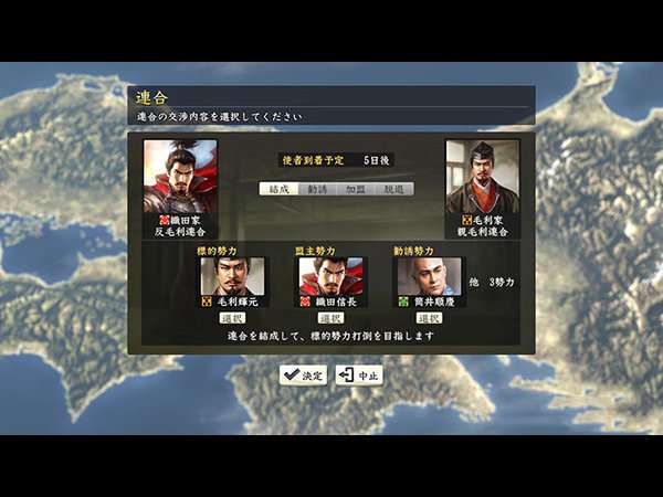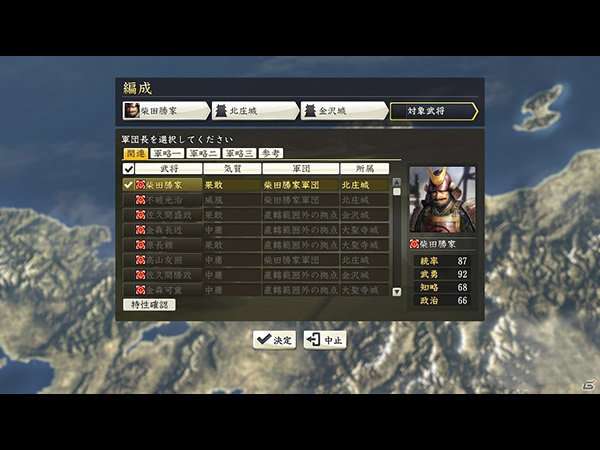 外交追加了联合、朝廷、役职等新要素,军团可作成由配下武将担任军团长来指挥的“配下军团”。