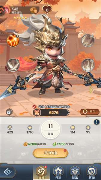《格斗三国志》是一款战略三国卡牌培养手游。在游戏中,玩家将遇到一个奇幻的三国世界,每个角色都是经过精心设计的。美术风格是Q-style,很可爱。游戏的核心玩法主要集中在卡牌战斗上,玩家需要不断培养和提升自己将军的实力。在游戏中,玩家可以根据将军的技能、属性和职业灵活地组建营地,并搭配深红火焰套装和清霜套装等特效装备。通过多样化的战略组合,打造自己最强大的团队。