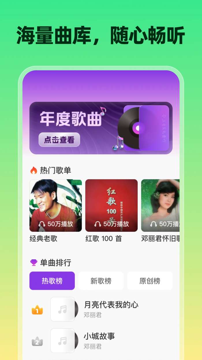 1、在线听歌:全网音乐免费听拥有庞大的音乐库,用户可随时随地在线收听流行、古典、电子等多种类型的音乐。