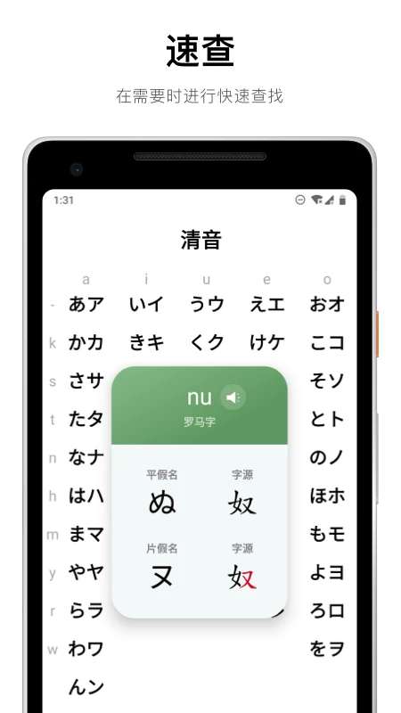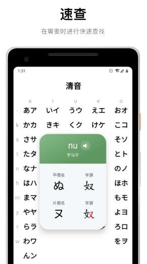 2、速查 速查表可以在你需要的时候,快速找到那个你想了解的假名,日期与数字。