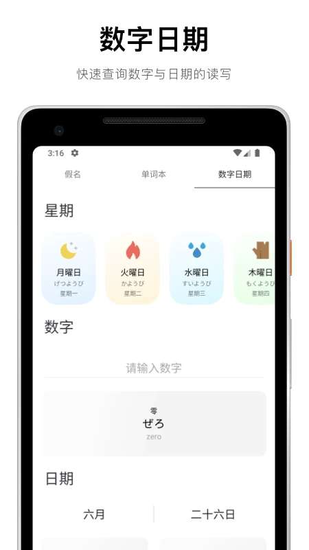 3、速查功能中可快速查询与数字、星期、日期相关的日语表达,例如输入数字可显示假名及罗马音,选择日期可查看日语月份与日子的读法。