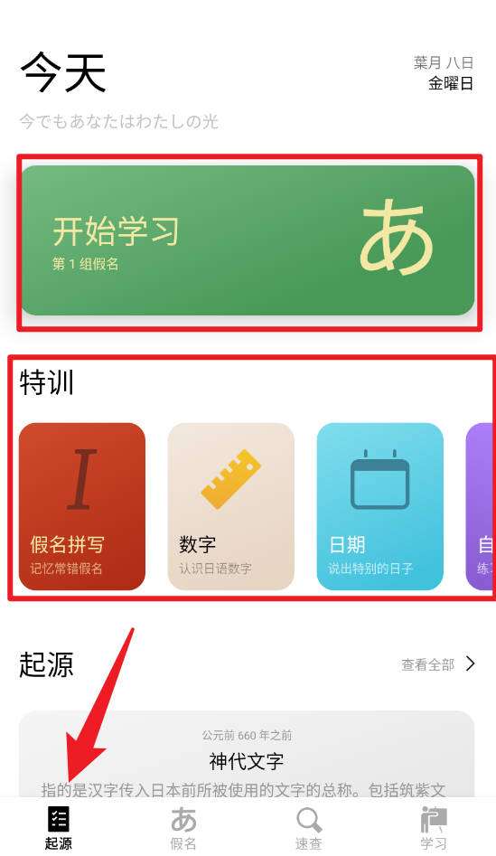 1、在起源点击开始学习按钮进入假名学习模块,支持从第1组假名开始逐步掌握,并可选择特训功能如假名拼写、数字、日期等专项训练,方便针对性提升日语基础。