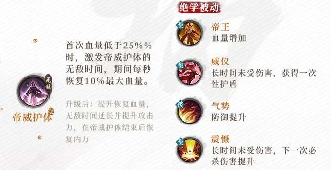 帝威护体:首次血量低于25%时,激发帝威护体的无敌时间,期间每秒恢复10%最大血量。升级后提升恢复血量,无敌时间延长并提升攻击力,在帝威护体结束后恢复内力。