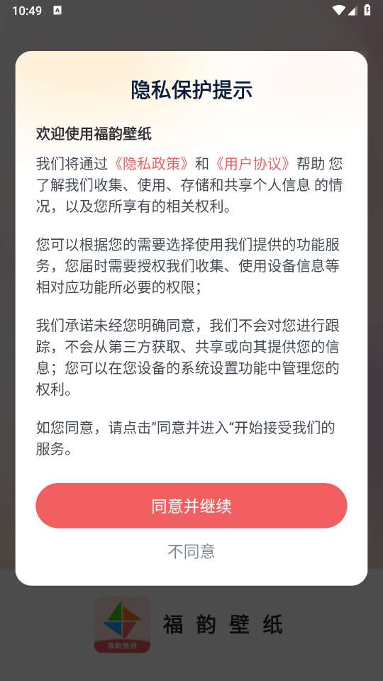 1、下载安装福韵壁纸app,同意相关的政策与协议。