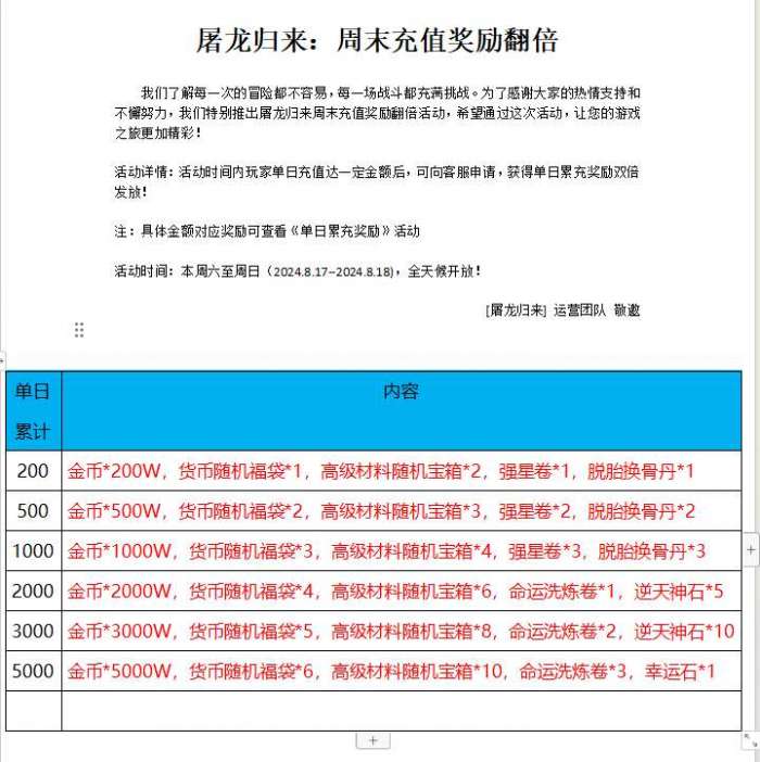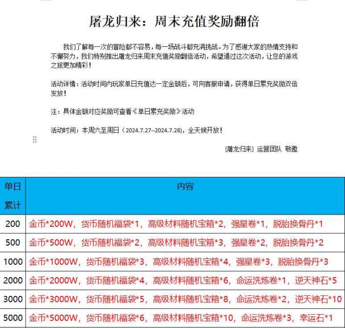我们了解每一次的冒险都不容易,每一场战斗都充满挑战。为了感谢大家的热情支持和不懈努力,我们特别推出屠龙归来周末充值奖励翻倍活动,希望通过这次活动,让您的游戏之旅更加精彩!