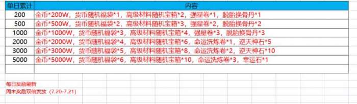 活动详情:活动时间内玩家单日充值达一定金额后,可向客服申请,获得单日累充奖励双倍发放!
