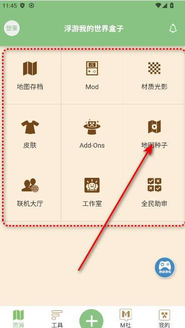 1、在本站下载安装好浮游盒子app,运行软件,这里有各种功能,如地图存档、mod、材质光影、皮肤等等,你可以根据你自己需要的功能,点击进去。