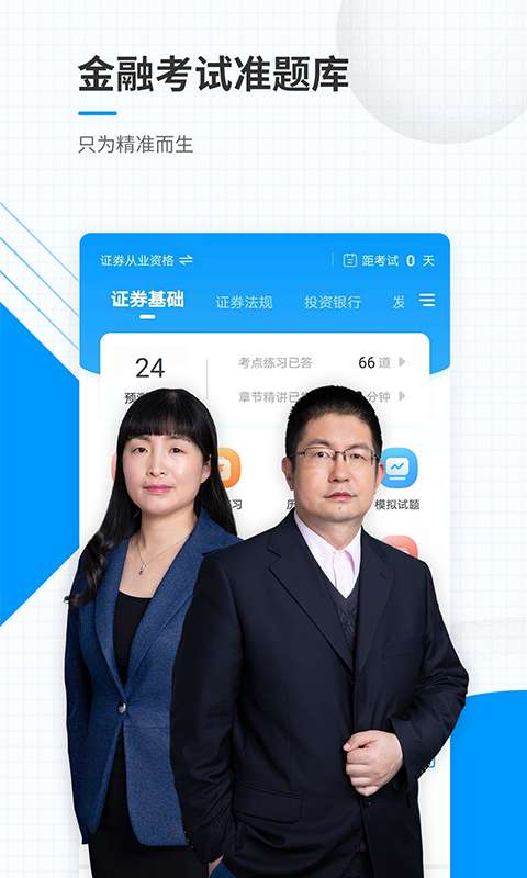 金融考试准题库是针对从事金融专业的大学生设计研发的一款一站式学习服务软件,它能帮助用户花费看书30%的时间顺利高分通过基金从业资格考试、证券从业资格考试、期贷从业资格考试等专项考试。全面收录近5年来历年真题、模拟题题库、每日一练、考点章节练习、考试高频考点等知识内容,可以根据十几万用户的答题情况,分析出高频考点和高频易错点,也能为你提供精准的能力评估报告。