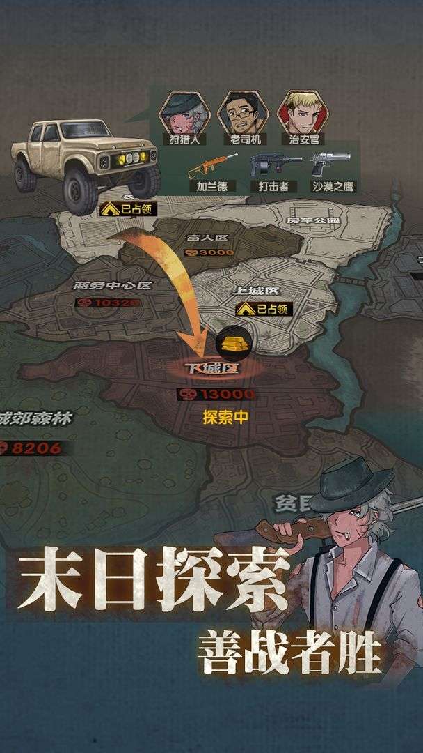 三、搜索据点获取食物或物资,人口数、战斗力、车辆效果、伙伴技能决定了搜索的结果。