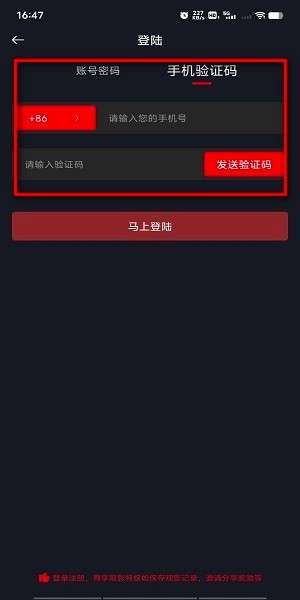 3、或者输入手机号码,获取验证码并填入,也是可以登录账号的。