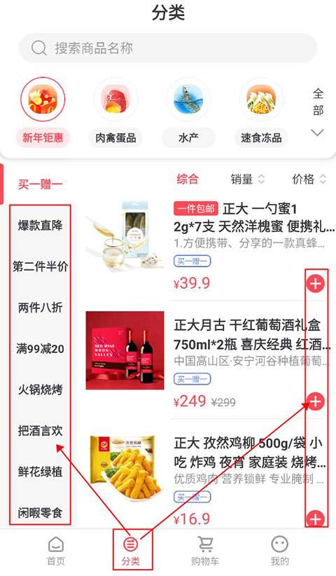 选择好门店之后就可以退出地址页面,点击下方的分类,进入分类购物页面,可以在左边选择自己想要的商品类型,然后点击右边的加号,将想要购买的商品加入购物车。