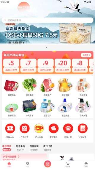 3、主页有很多的商品可以选择,在这里新用户注册就能领取券包;