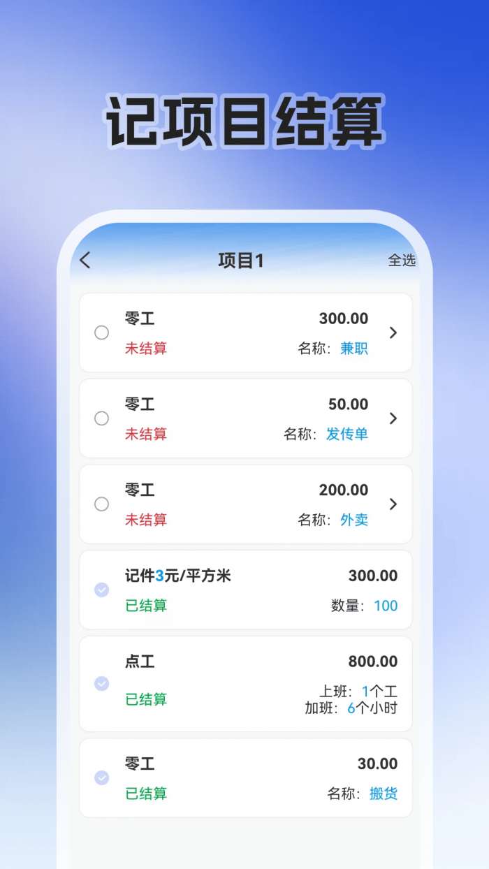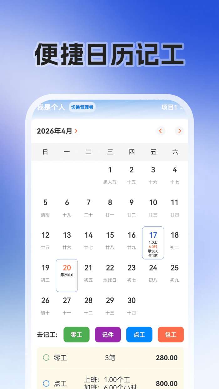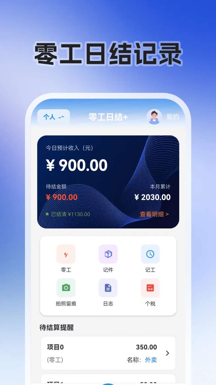 零工日结 + 是一款专业记账工具,专为灵活工作者、临时工、小组长设计。它深度集成了记账、计件工资、零工记账、临时工签到、工地记账、项目管理等核心功能。为装修、搬运、保洁、工地等行业量身定制,精准解决行业 “记账难、账目乱、结算慢” 的痛点。无论是按日计酬的零工、按次计酬的工作,还是计件合同或计件工资的工作,都可以轻松适应。有了水印摄像头跟踪取证功能,每一笔血汗钱都有迹可循,一清二楚,告别口头协议和糊涂账,成为灵活用工的贴心薪酬管理者。