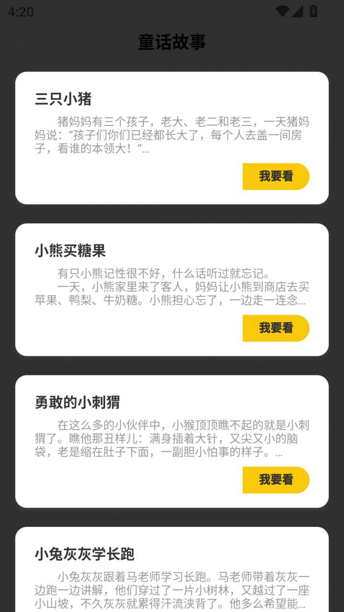 2、一键直达阅读页面。每篇故事都设置了 “我要看” 快捷入口,点击就能直接进入阅读界面,操作简单易懂,孩子自己也能轻松上手。