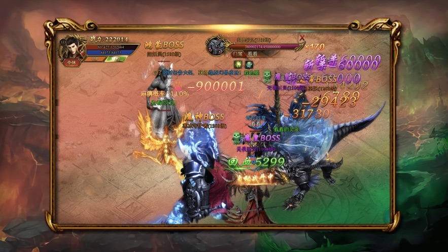 1.千人同屏战斗,而且还能跨服攻打世界boss,会根据你们所有人的伤害发放不同的道具奖励的。