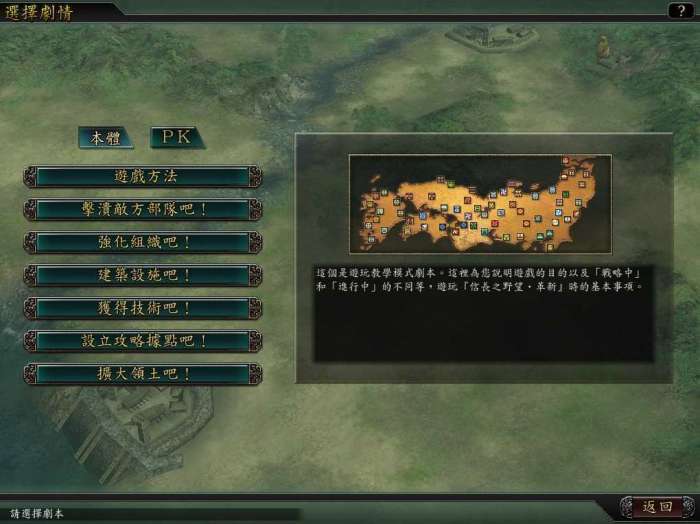 A剧本模式,游戏提供了4个势力的剧本,分别为织田,武田,上衫,伊达四家。每个剧本有15章本格剧情,1个番外篇,2个特别篇剧情。织田为初始剧本,织田篇15章本格剧情完成后开启武田篇,以此类推。