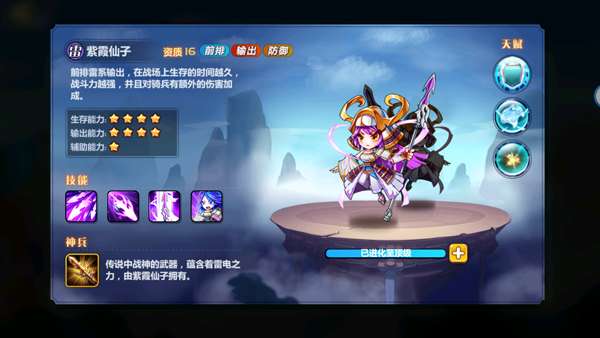 6、紫霞:前排雷系神将,能打能抗,目标处于潮湿状态,大招可能会直接一套带走一个武将,“雷光阵”是核心技能,控制对面智力最高武将,一般智力武将都是输出或奶,这样能很好的限制对方阵容,“女武神”可让紫霞攻击力一直提升。