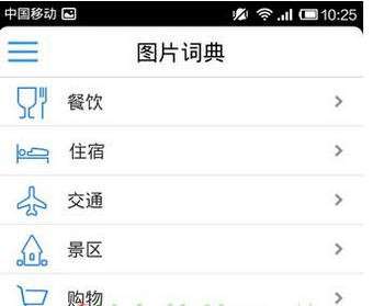 让我们先看一下图片词典。你可以找到餐饮、住宿、交通、景点和购物的选择,这些选择在旅行中非常有用和常用。