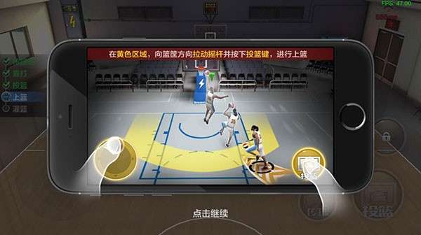 2、上篮:黄色区域内以灌篮的方式操作,和灌篮区域不同,有无防守人都可上篮。