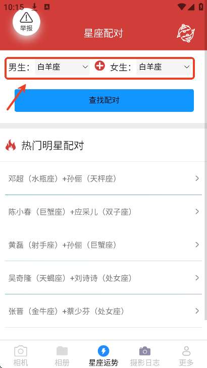 4、对星座感兴趣的用户们还可以使用星座配对功能,了解两个星座之间的匹配度。