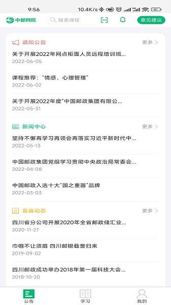 中邮网院是一款专业的网络学院培训学习平台,内容涵盖中邮网院相关的资讯信息和通知、学员可以学习的资源、当前在线运行的培训班、用于学员交流的问答中心以及学员相关的信息查询。在这个平台上面也是带来了全面的学习服务,用户是能够随时随地查看到各类资讯动态信息的,能够极大的满足广大用户的学习需求,当然您可以在平台享受到自由交流的体验。
