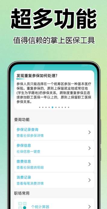 医保社保查询助手app是一款可以帮助用户在手机上快速查询个人医疗保险和社会保障信息的软件。用户只需填写基本信息即可获取查询结果。本应用程序亦提供个人所得税计算服务,并及时更新最新的政策发展,让使用者随时了解政策的变化。它配备了高度智能的计算工具,帮助每个人快速计算医疗保险费用。操作步骤非常简单省时,完全没有烦人的广告。它不仅可以让你随时随地跟踪你的医疗保险账户状态,还可以为你的医疗费用提供精确的计算和实时的医疗保险政策信息。