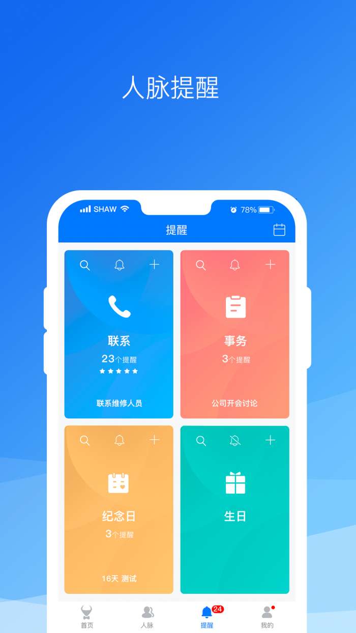 3、功能完善:包含名片扫描、短信库、短信群发、礼品店、人脉管理、事务提醒、生日、节日、纪念日管理等多种功能,全面满足你的日常需求。