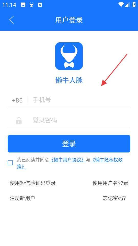 1、懒牛人脉登录页,需填手机号、密码,勾选协议后点登录,也可选短信验证码、用户名登录方式。