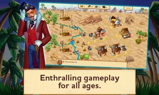 帝国的王冠这款游戏中里面的剧情设定运用是以不同的欧美复古风格,而且能够看到不同的复古场景,比方说老旧的报纸或者是马车等等,每一个角色的服装打扮也是特别有上世纪帝国风格的。在这里,玩家们根据游戏的文字提示来建造新的王国,然后根据游戏中的新线索来完成整个剧情的解锁。一开始的建筑场地提供是在沙漠中的,要先从绿植种植,还有河水引流开始,拥有了这些基本的自然条件设施,之后就可以开始收集建造,要用到的材料。