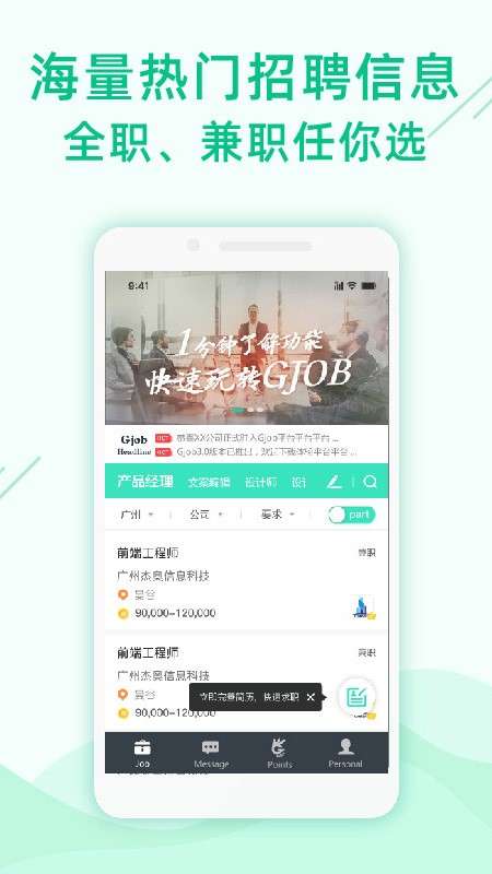 Gjob在这款强大功能的APP当中是有着超多的兼职和工作是可以让你在上面去进行选择的,是专门为那些找不到工作或者是没有好工作的用户们在手机上打造的一款能够更加方便便利你进行寻找工作兼职的APP,而且上面是有着超多的企业是会进行随时随地的发布职位的,不管你是大学生实习还是小青年寻找工作的,因为里面的工作分布都是非常的多的,你可以在上面到详细里面去进行查找你自己想要寻找的类型工作,一键就可以上传你自己的简历与老板面对面去进行交流,无需和其他的人事部进行交流的。