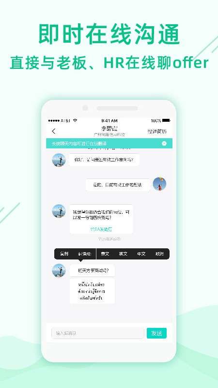 4、快速一键入职,在APP上面你就可以实时的与老板去进行在线沟通,让你更快更容易的了解。