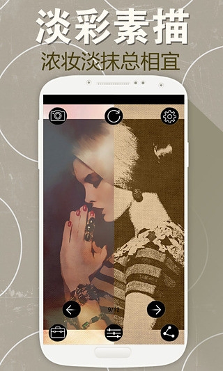 3、通过升级的核心技术对人像边缘处理更为精妙,得到效果更棒的清晰曲线,操作指南:左右方向按钮可以切换12种不同的风格:铅笔素描、怀旧素描、时光机、铅笔淡彩 。另有多种纸张风格可选,配合不同的素描风格,精彩浮现指端。