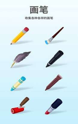 1.在游戏中,有各种颜色和形状的画笔如铅笔、彩笔、蜡笔等。通过游戏收集各种画笔用来闯关。