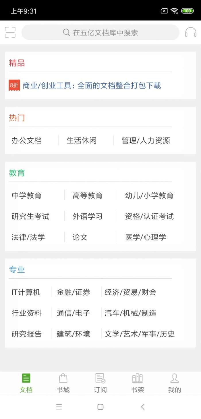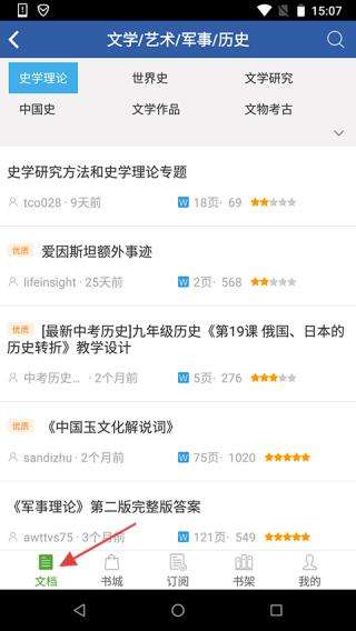 1、点击文档界面,有史学理论等分类,罗列众多文档标题,下方有文档等功能按钮。