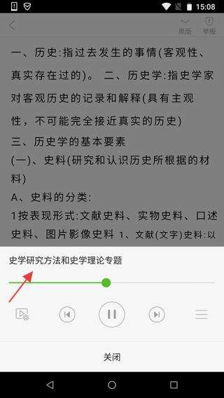 3、点击文档阅读页,显示具体文字内容,底部有播放进度条及播放、暂停等音频控制按钮。