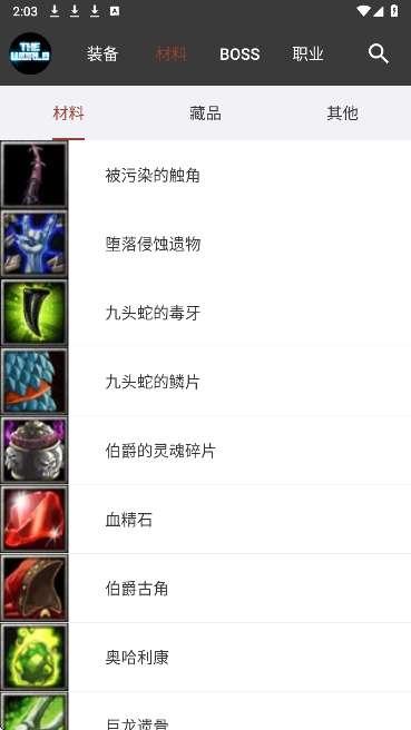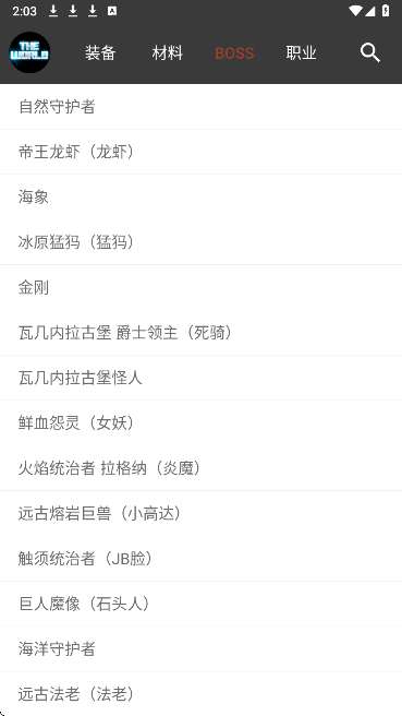 1、世界RPG软件界面简洁明了,主要分为装备、材料、boss、职业等几个板块。