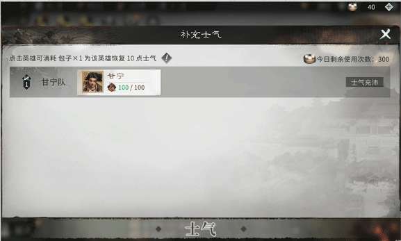 2、每场战斗后,队伍中的每个英雄都将降低一定的士气值,队伍战斗时士气以队伍中最低士气的英雄作为队伍的士气值,士气可以通过时间和包子恢复,士气在60以下时会降低队伍的战斗能力。