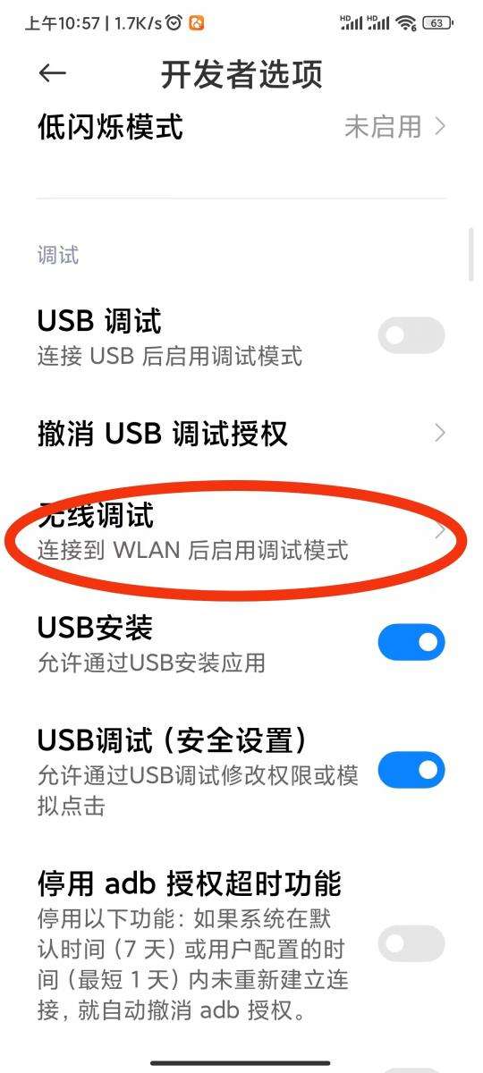 5、以小米手机为例,在“开发者选项”中找到并打开“无线调试开关”。