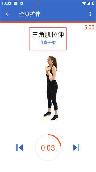 3、进入全身拉伸锻炼后,会显示三角肌拉伸准备开始的提示,跟随展示的动作完成锻炼,页面计时会同步记录动作时长。