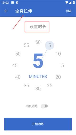 2、选择全身拉伸后进入设置时长页面,调整锻炼时长数值,可开启随机锻炼功能,确认后点击开始锻炼按钮进入锻炼环节。