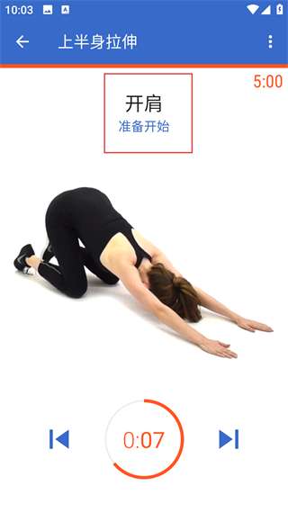 4、切换到上半身拉伸锻炼,会显示开肩准备开始的提示,跟随展示的动作进行练习,页面计时会实时记录该动作的持续时间。