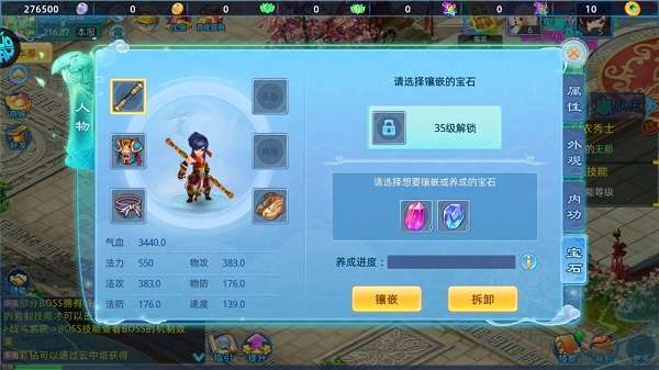 镶嵌宝石后,其实际生效的属性将根据已镶嵌宝石的等级来判定。宝石等级越高,升级所需进度也随之增加。每次镶嵌一颗宝石,进度固定增加1点。每个装备部位仅能镶嵌一种类型的宝石。若需更换,必须先拆卸当前宝石,方可进行重新镶嵌。