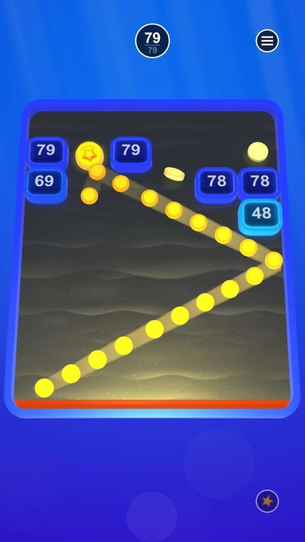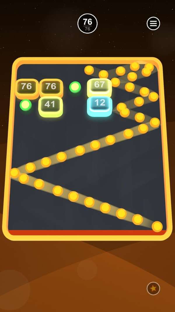 3、比较多的弹射球数量,完成大数额的方块弹射消除,每一个方块上的数字都不同,不断地折射,然后来回的反弹才能让上面的数字慢慢的变小。