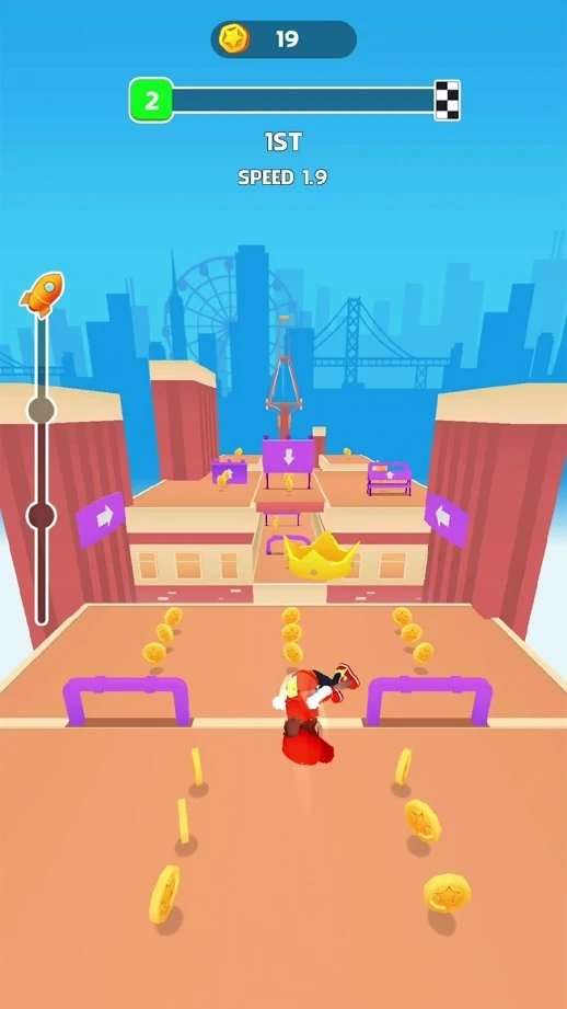 在高楼大厦上飞跃,游戏中的各种道具是扭转名次的好东西,使用道具干扰自己的对手