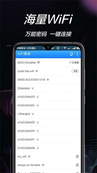 1.软件中有着上一个WiFi热点的云端数据库,随时随地都可以连接到WiFi,让你能够特别的省流量。
