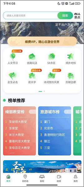 1、下载安装好世界景点大全软件,进入首页你可以进行搜索景点,还有许多的榜单推荐。