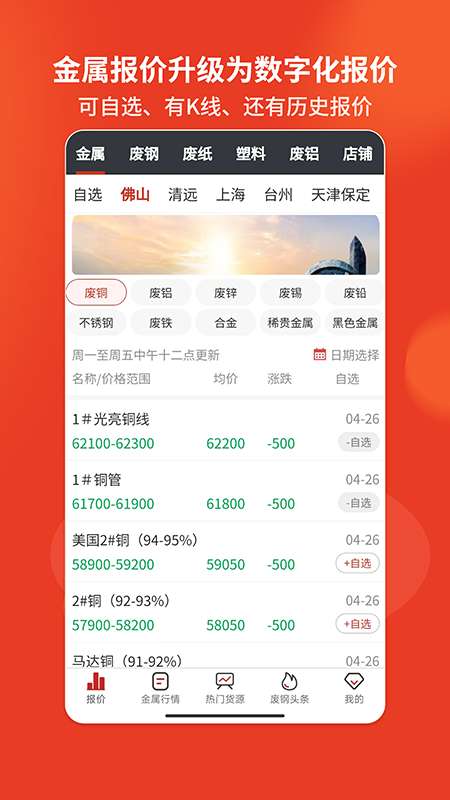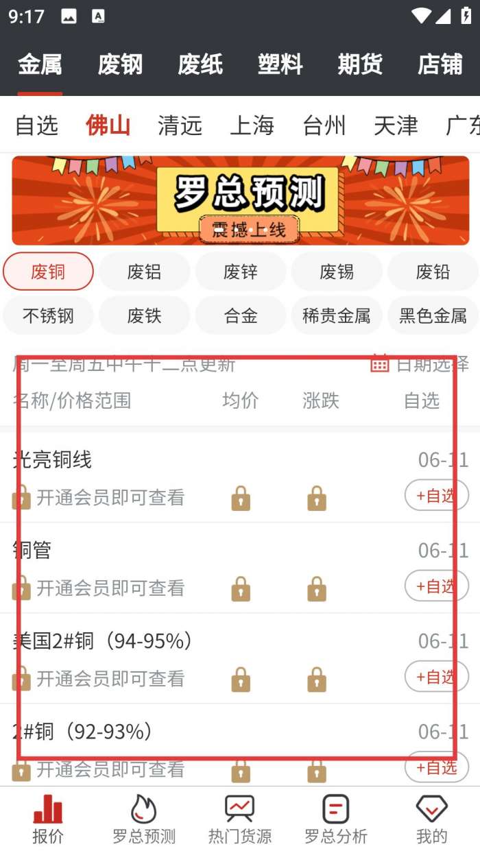 2、报价页面有金属等分类,选地区看废料价格,部分信息需会员查看,助力业务决策。