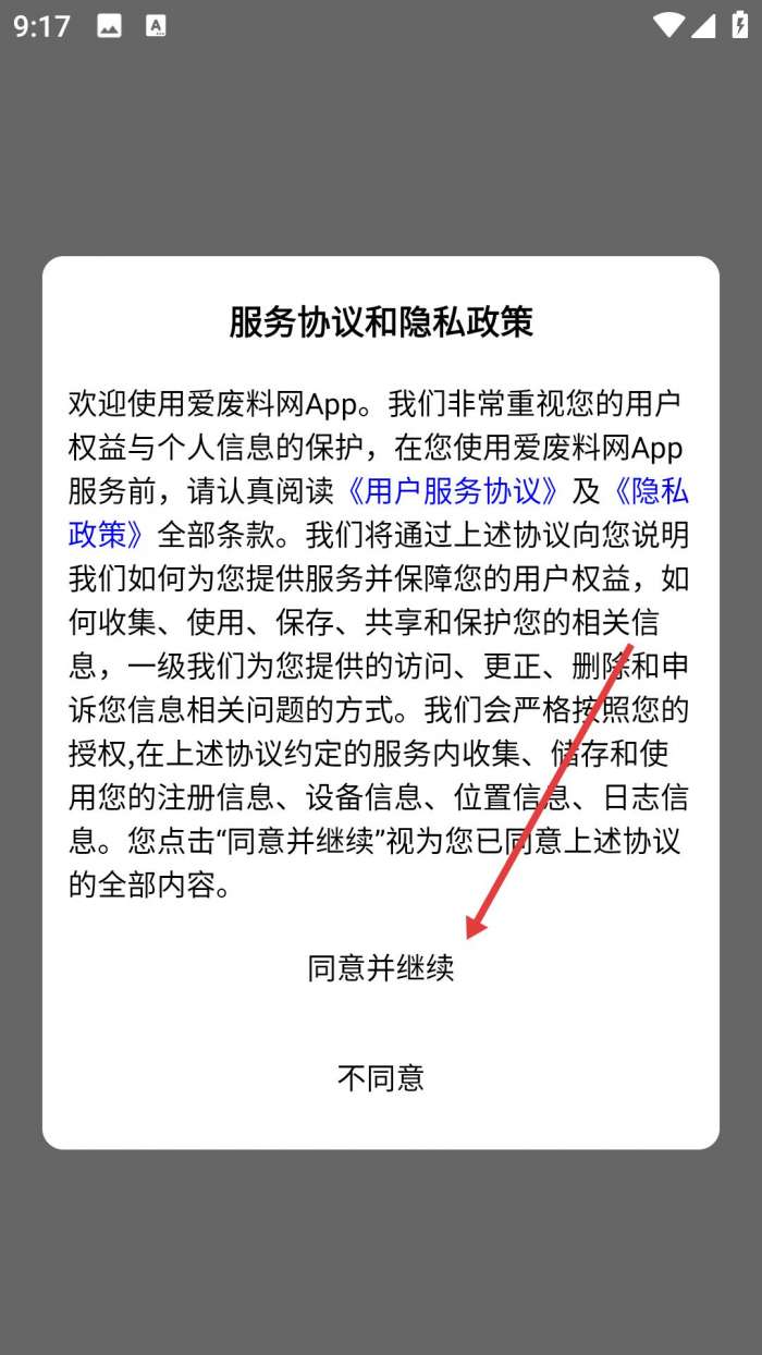 1、下载软件后打开,需阅读服务协议和隐私政策,同意后进入应用,开启废料业务操作。